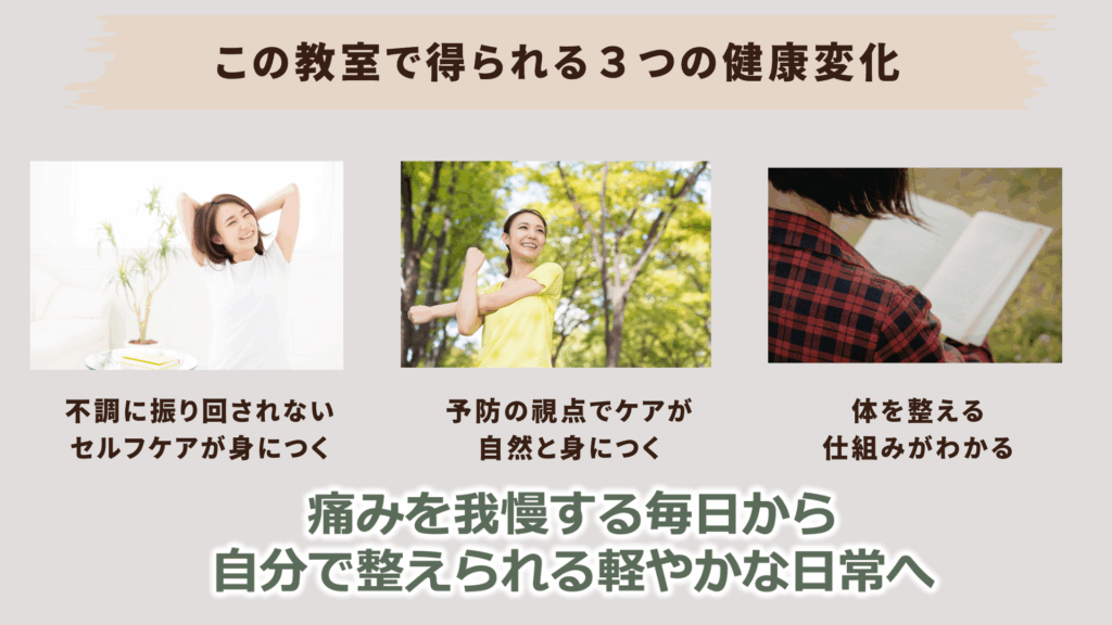 無料の健康教室で、“一生モノのセルフケア”を手に入れましょう。