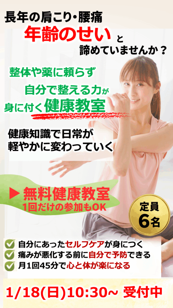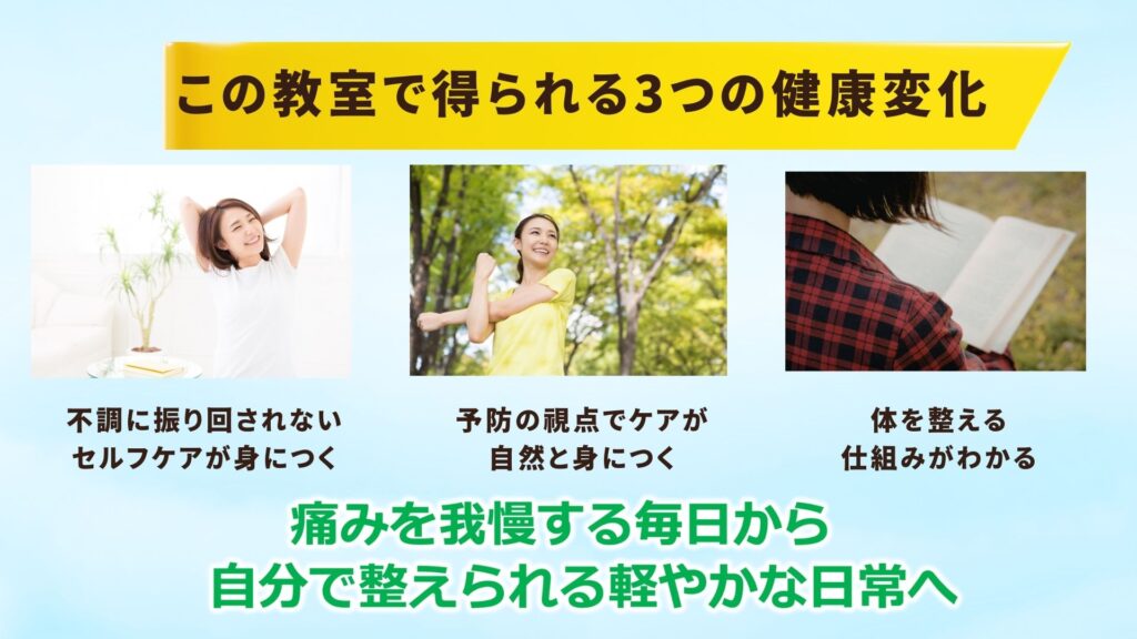 無料の健康教室で、“一生モノのセルフケア”を手に入れましょう。