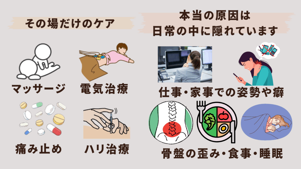 病院や整体で一時的に良くなっても、また痛みが戻ってしまう。それは、本当の原因=日常のクセや身体の使い方に気づいていないからです。
